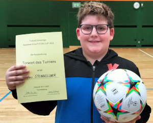 Bei der Sparkassen Schülerliga Bezirksmeisterschaft im Futsal wurde Lukas Steinkellner (3A) von den Trainern zum Torwart des Turniers gewählt! Mit seinen Reflexen, seinen heldenhaften Paraden und seiner Fangsicherheit ließ er die gegnerischen Stürmer reihenweise verzweifeln. Lukas hielt in den vier Vorrundenspielen seinen Kasten souverän sauber und hatte maßgeblichen Anteil daran, dass seine Mannschaft ungeschlagen bis ins Halbfinale vorstieß! Schließlich belegte die IT-Mittelschule Grein den hervorragenden 4. Platz. Der Großteil der Mannschaft bestand aus Schülern der 1. Klassen.